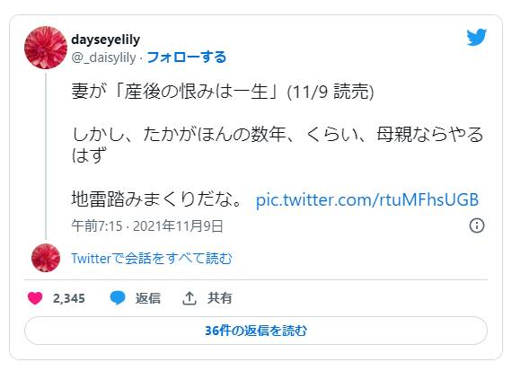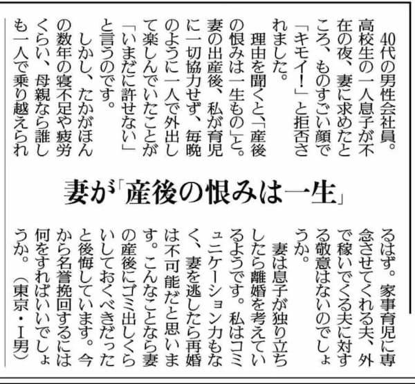 「産後の恨みは一生」というタイトルで夫が妻に対する嘆きを投稿した人生案内に多くの批判が殺到しています。