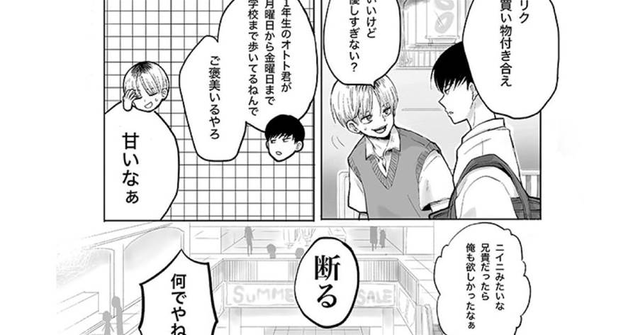 「金曜日のご褒美」。1週間学校をがんばったごほうびが欲しい!というオトト君のお願いを叶えるために、リクを誘って買い物に出かけたニイニ。ニイニが選んだご褒美は……?