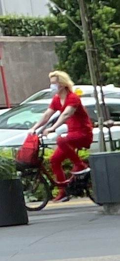 息子が「ホンダ行く!」というので、青山の本社へ行ったら、赤いバイクに夢中だったのですが…。たまたま撮った写真の向こうに全身赤い金髪の男性が…。