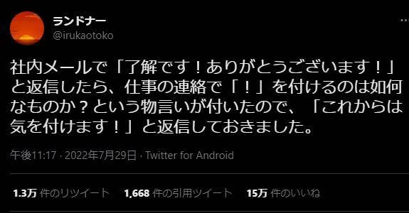 仕事で「!」はいかがなものかと言われたのでこう返したそう・・・
