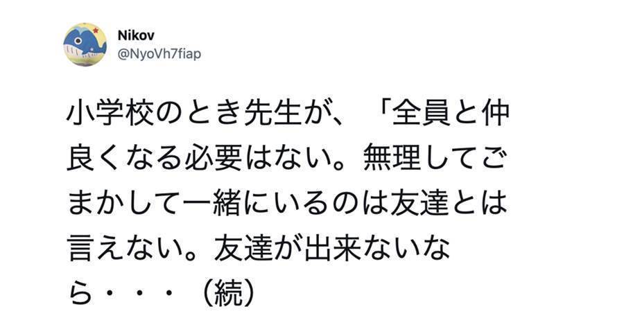 「全員と仲良くなる必要はない。友達は無理に作ろうとせず、友達ができないならwwww」ある小学校の先生の言葉が胸に突き刺さる!