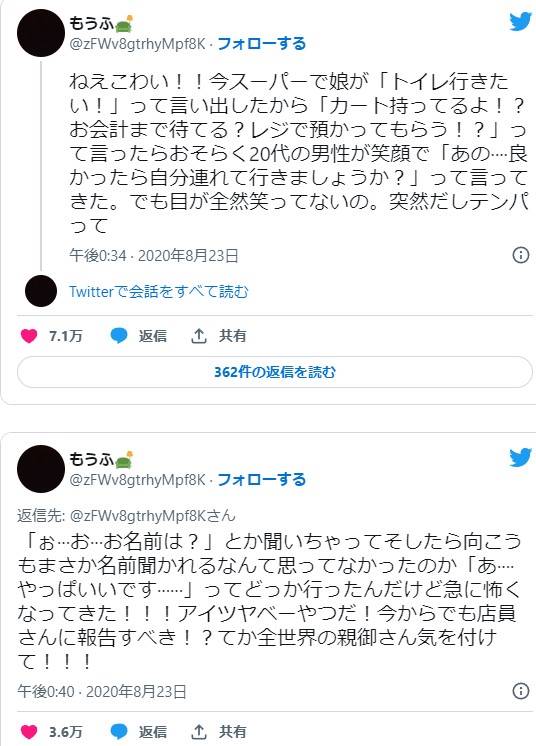 【※注意喚起】スーパーで娘が「トイレ行きたい!」と言うので会計まで我慢できるか聞いていたら、20代位の男性が声をかけてきて…