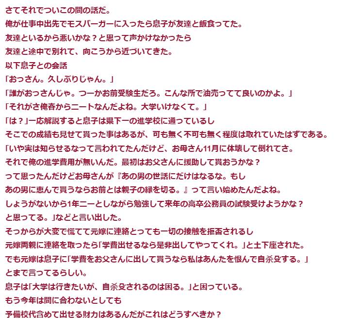 浮気がばれて嫁と離婚。この前受験生の息子と偶然会ったら息子が「俺春からニートなんだよね。大学いけなくて」俺「?」すると息子が→ 想像もしてなかったまさかの事態に