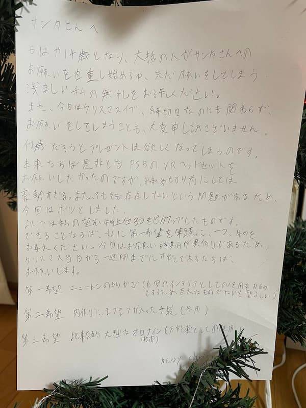 クリスマスツリーにつるされてた14歳の書いたサンタさんへの手紙が秀逸すぎると話題になっています。