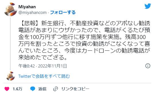 新生銀行からの勧誘電話があまりにもしつこかったので、その度に他行にお金を移していたら・・・嘘だろ