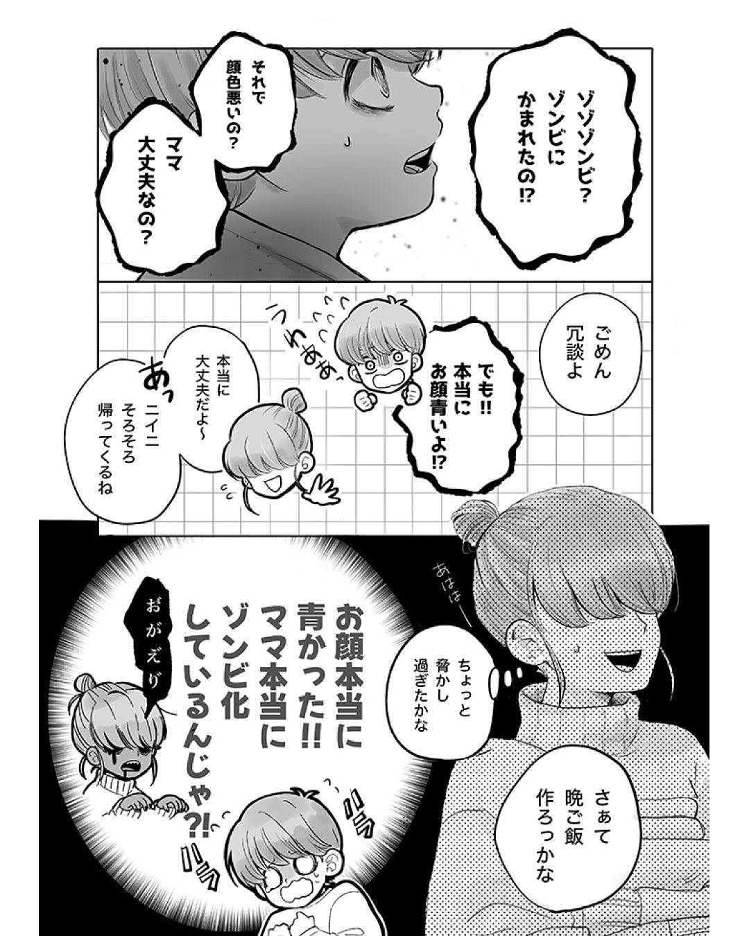 ママのお顔が青いのは、ゾンビに噛まれたから? 帰ってきたニイニの顔もなんだか青い。これも、もしかして……!