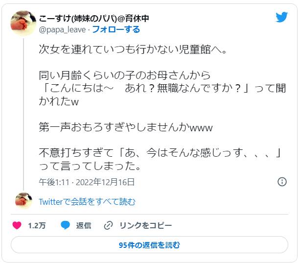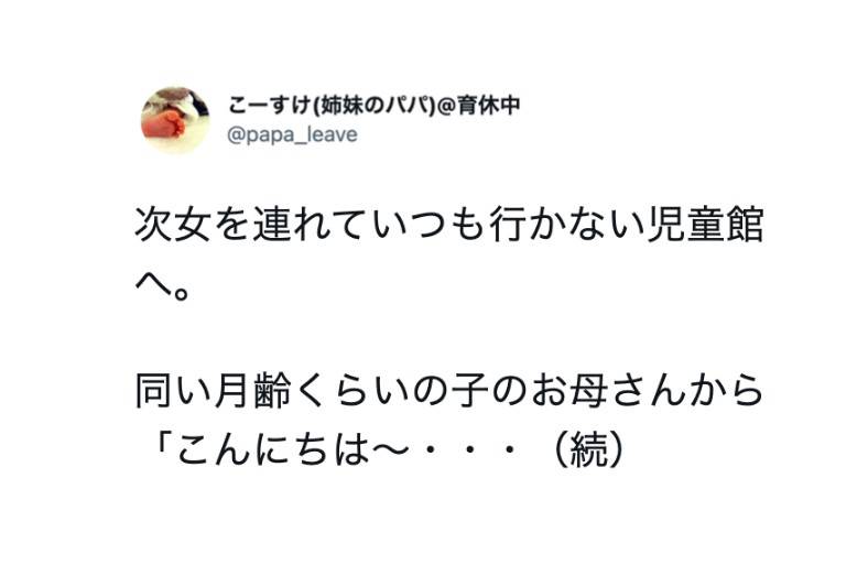 子供を連れ児童館を訪れた父親。→同じ月齢くらいの子のお母さんからかけられた言葉に・・えっ?(笑)