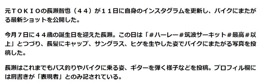 【画像あり】長瀬智也、バイクにまたがる44歳最新ショットがカッコよすぎると話題に!