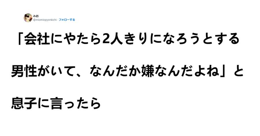 「会社にやたら2人きりになろうとする男性がいて、なんだか嫌なんだよね」と息子に言った結果… 息子からのアドバイスが斜め上すぎた…