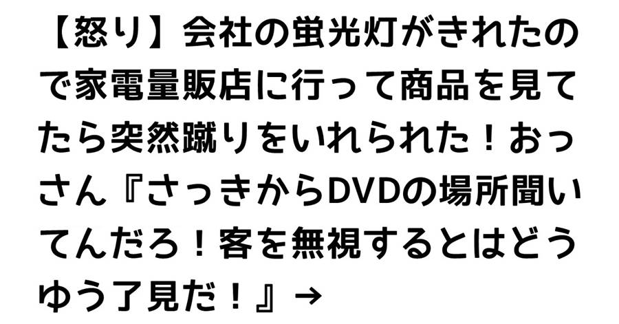 【怒り】会社の蛍光灯がきれたので家電量販店に行って商品を見てたら突然蹴りをいれられた!おっさん『さっきからDVDの場所聞いてんだろ!客を無視するとはどうゆう了見だ!』→