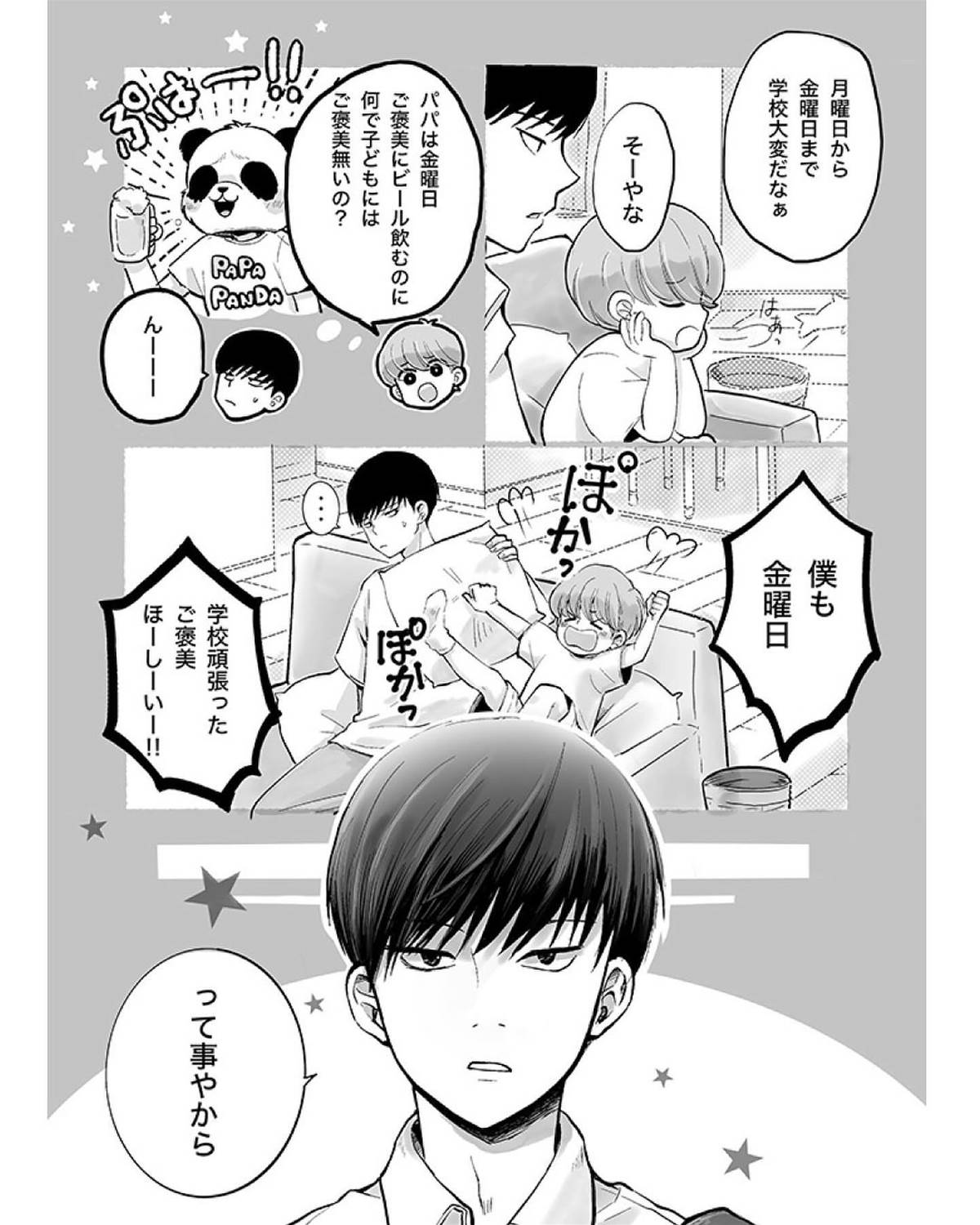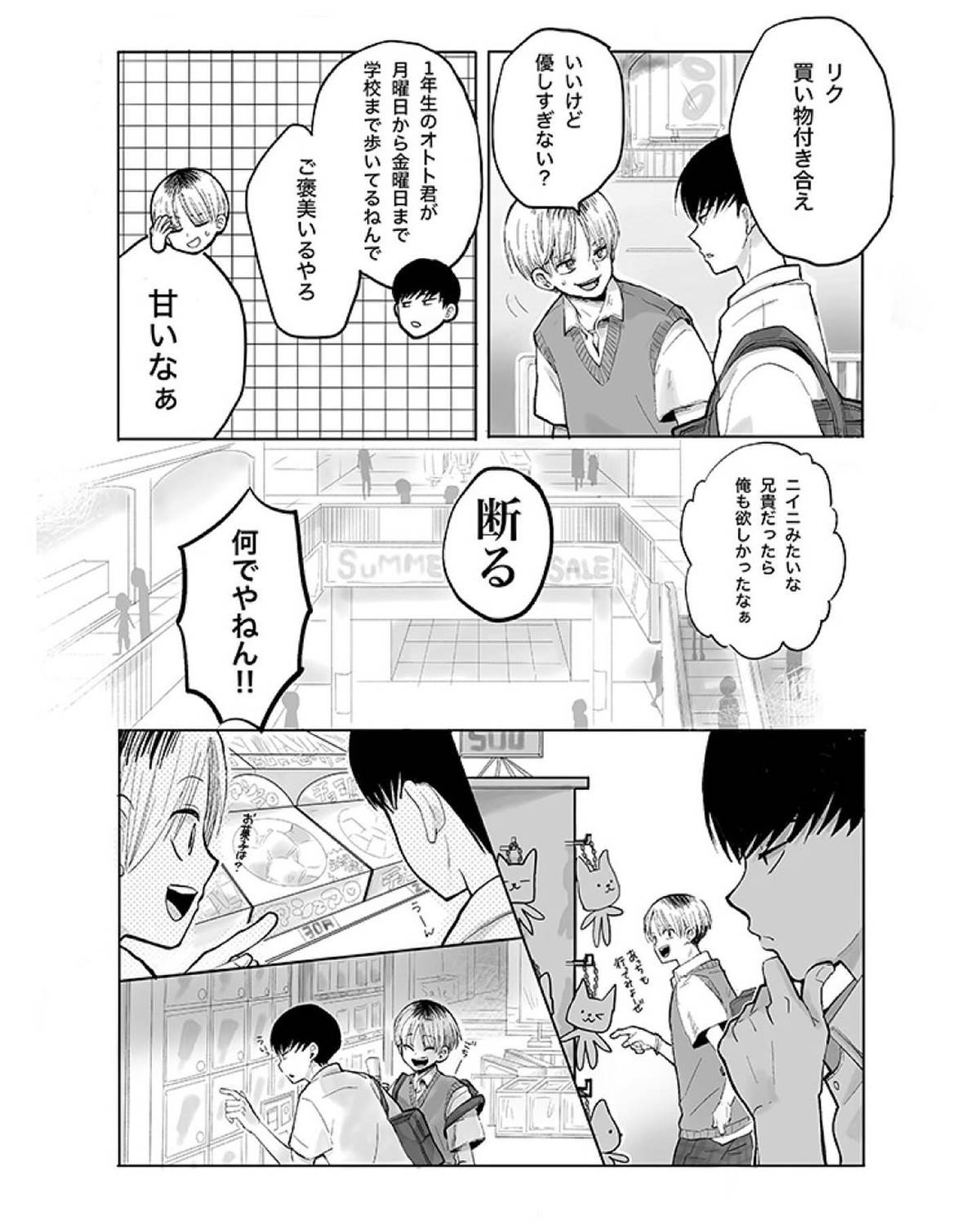 「金曜日のご褒美」。1週間学校をがんばったごほうびが欲しい!というオトト君のお願いを叶えるために、リクを誘って買い物に出かけたニイニ。ニイニが選んだご褒美は……?