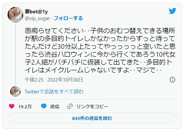 おむつ替えのため多目的トイレの前で待つこと30分。中から出てきたのは・・・