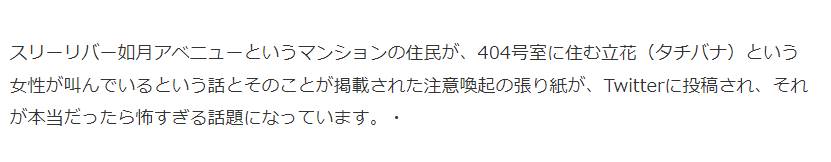 【怖い話】スリーリバー如月アベニューというマンションの404号室に「タチバナ」という不審な女性が出没した話がホラーすぎる