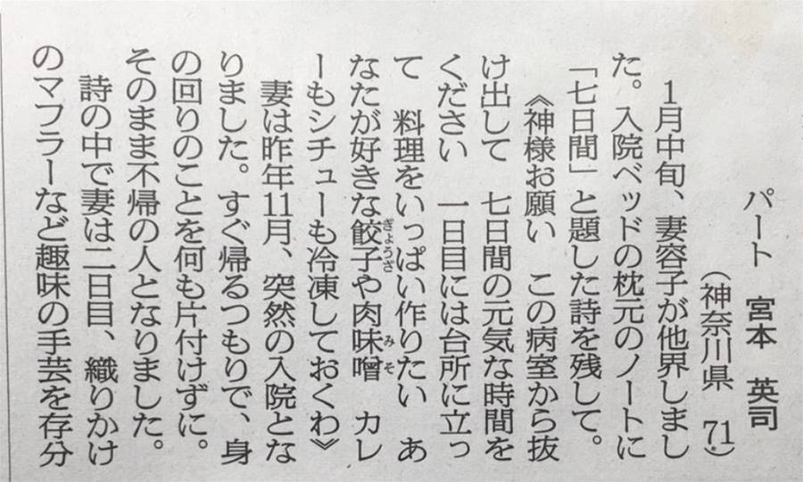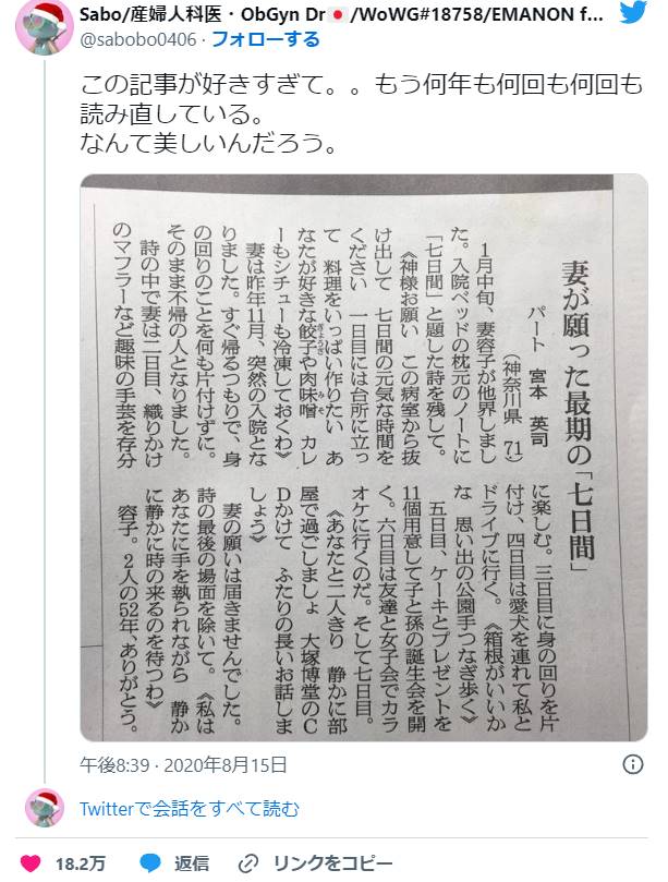 妻が願った最期の「七日間」と題し新聞に寄せられた記事が美しすぎると話題に。まるで映画みたい・・・
