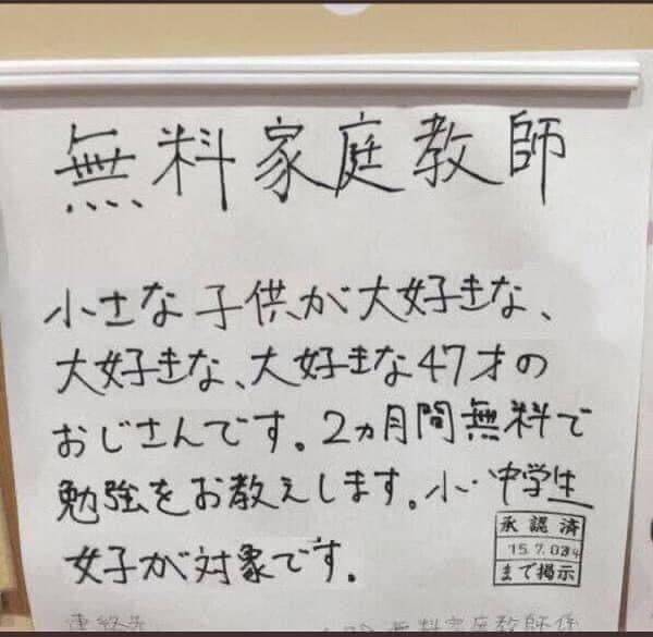 「小さな子供が大好きな47才のおじさんです。2か月間無料で勉強を教えます。小中学生女子が対象です。」という家庭教師の貼り紙がツッコミどころ満載だと話題になっています。