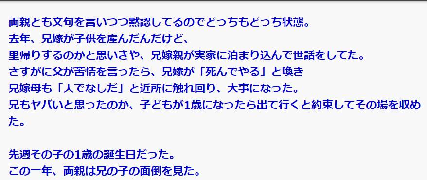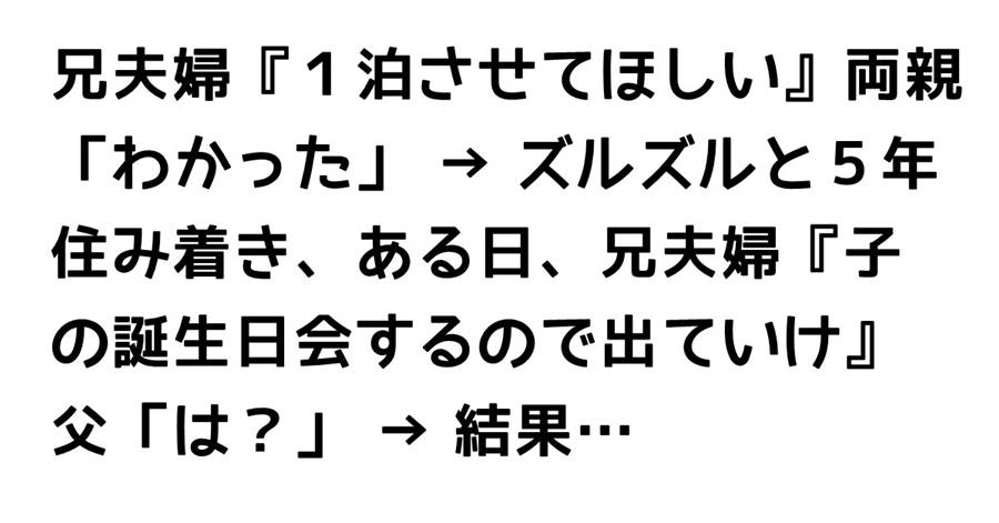 兄夫婦『1泊させてほしい』両親「わかった」 → ズルズルと5年住み着き、ある日、兄夫婦『子の誕生日会するので出ていけ』父「は?」 → 結果…