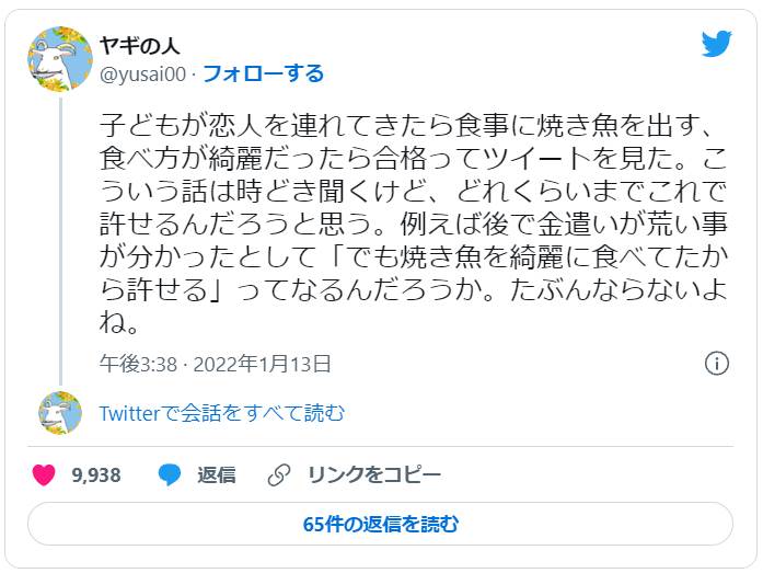 「子どもが恋人を連れてきたら食事に焼き魚を出す」という親御さんがいるそうで。
