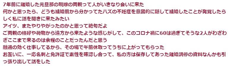 【衝撃】7年前に離婚した元旦那の現嫁の両親がいきなり会いに来た。現嫁両親「あなたに話を聞きに来た」私(あいつ…またやりやがったのか)→なんと…