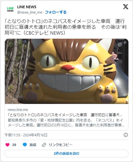 となりのトトロの「ネコバス」をイメージした乗り物、盲導犬を連れた客の乗車をお断りしてしまう