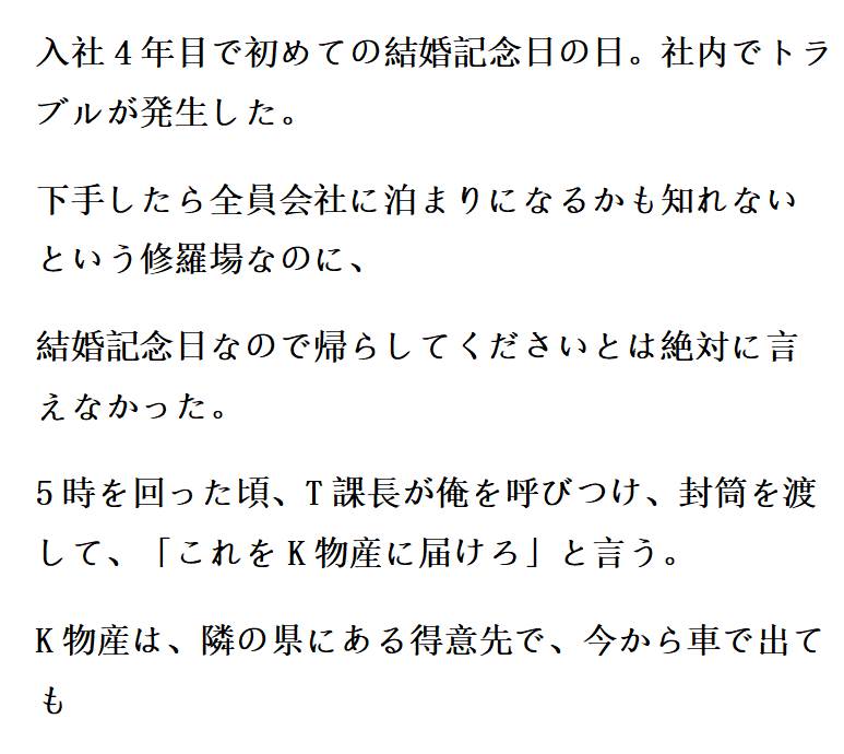 社内でトラブルが発生、しかしその日は初めての結婚記念日だった。上司に呼び出されて受けた指示が…