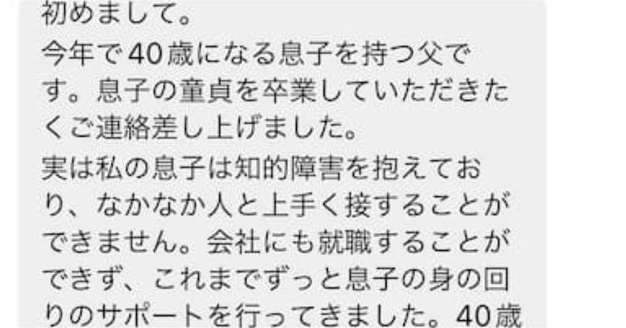 今年で40歳になる息子を持つ父親です。息子の童貞を卒業させたくご連絡差し上げました。息子は知的障害を抱えており・・・