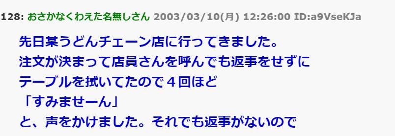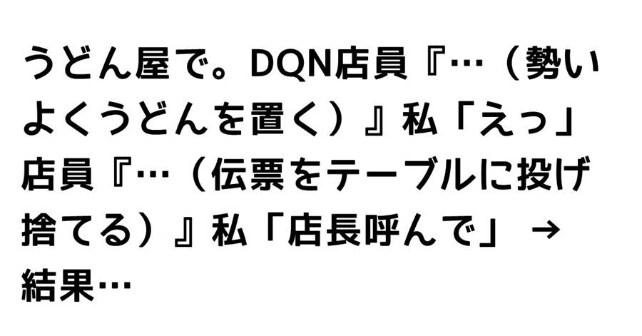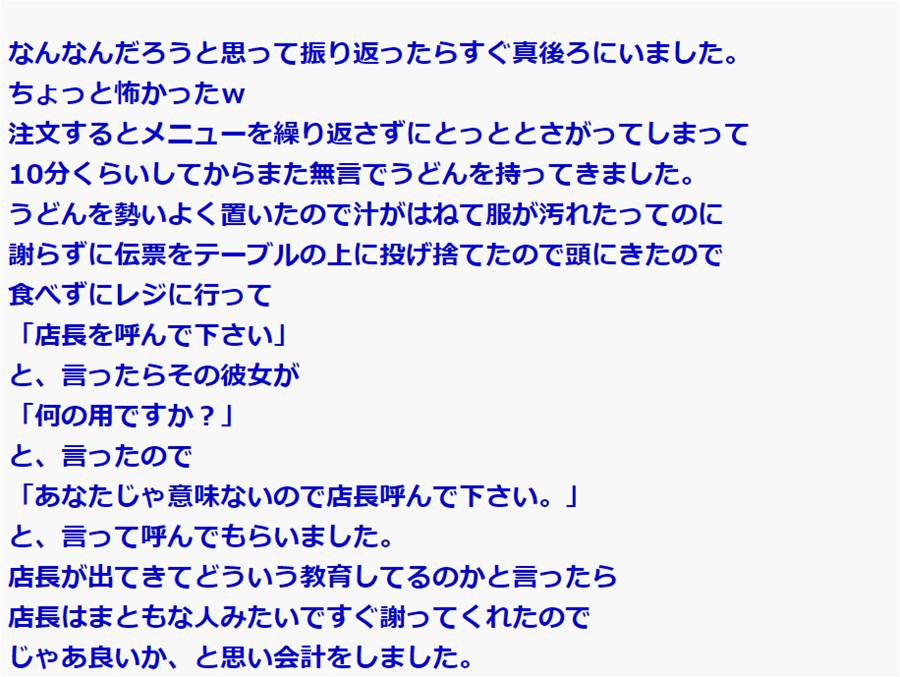 うどん屋で。DQN店員『…(勢いよくうどんを置く)』私「えっ」店員『…(伝票をテーブルに投げ捨てる)』私「店長呼んで」 → 結果…