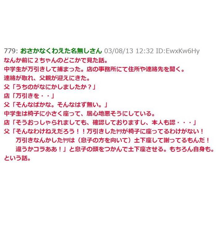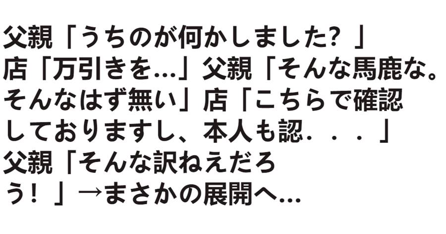 父親「うちのが何かしました?」店「万引きを…」父親「そんな馬鹿な。そんなはず無い」店「こちらで確認しておりますし、本人も認...」父親「そんな訳ねえだろう!」→まさかの展開へ…