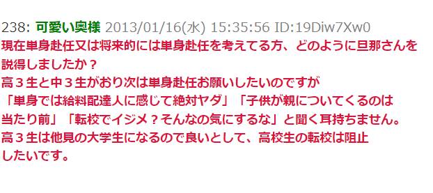 旦那の転勤が決まった。私「子供達は高3と中3だし転校させたくない。単身赴任して」旦那「それだと給料配達人に感じて絶対にヤダ。子供が親についてくるのは当たり前」私「!?」