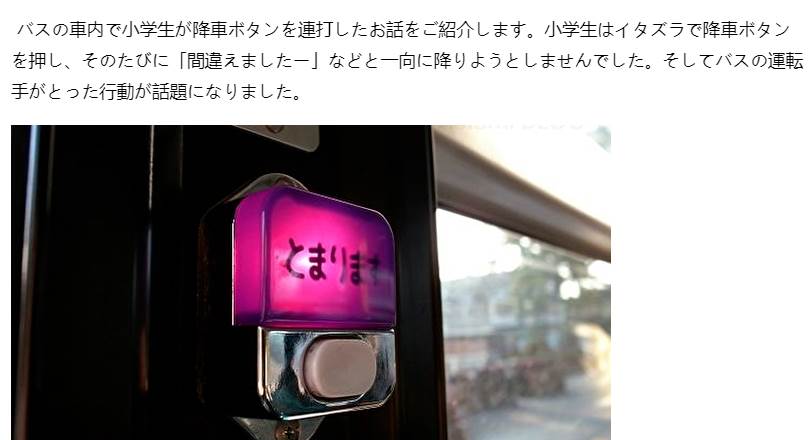 バスの車内で小学生が降車ボタンを連打したお話をご紹介します。小学生はイタズラで降車ボタンを押し、そのたびに「間違えましたー」などと一向に降りようとしませんでした。そしてバスの運転手がとった行動が話題になりました。