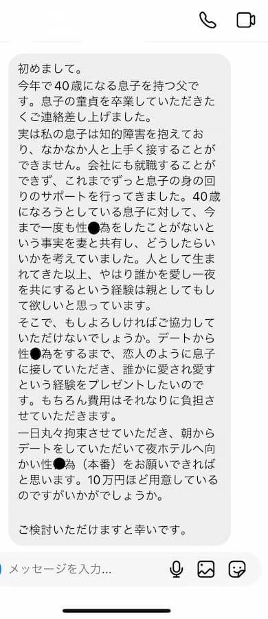 知的障害のある40歳になる息子を持つ父親が、息子の童貞を卒業させたいと思い、風〇嬢にしたDMの内容が話題になっています。