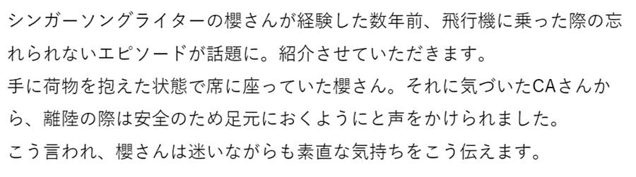 シンガーソングライターの櫻さんが経験した数年前、飛行機に乗った際の忘れられないエピソードが話題に。紹介させていただきます。
