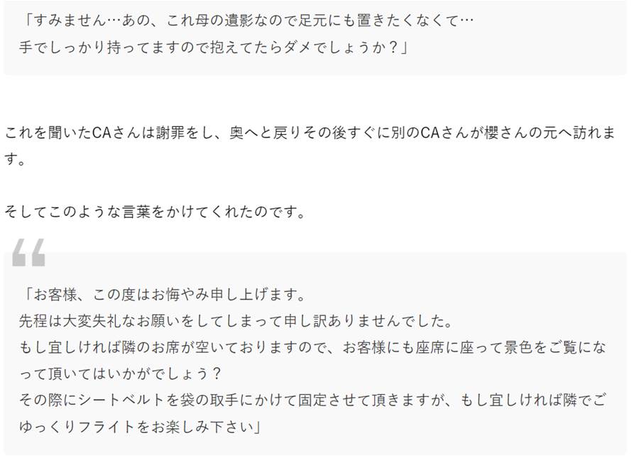 母の遺影を持って飛行機に乗った女性→それに気づいたCAさんが神対応・・・。涙が止まらなかった。