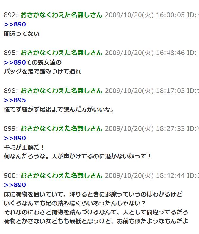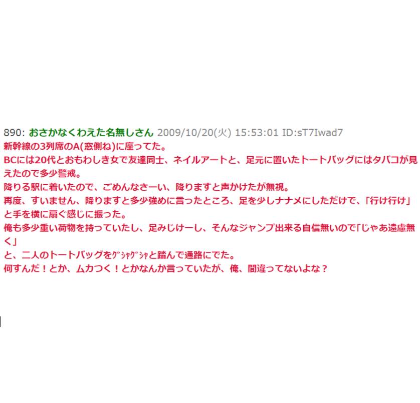 新幹線で3列席の窓側に座っていて隣2席に女2人。駅に着いて足元の荷物を退けてもらおうと「降ります」と声かけたが無視→再度言ったら足を斜めに「行け行け」俺「じゃあ遠慮なく」