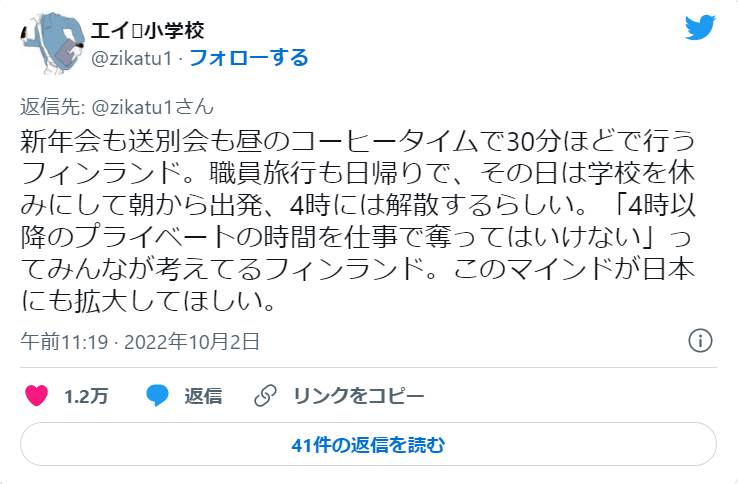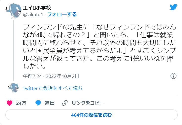 そんなフィンランドで先生に「なぜフィンランドではみんなが4時で帰れるの?」と質問し返って聞いた答えに1億いいねを押したい。と投稿されたツイート。