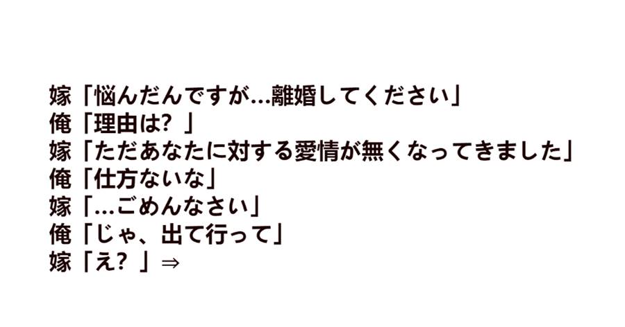 嫁「悩んだんですが…離婚してください」俺「理由は?」嫁「ただあなたに対する愛情が無くなってきました」俺「仕方ないな」嫁「…ごめんなさい」俺「じゃ、出て行って」嫁「え?」⇒