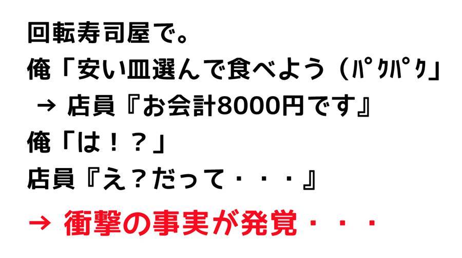 回転寿司屋で。俺「安い皿選んで食べよう(パクパク」 → 店員『お会計8000円です』俺「は!?」店員『え?だって・・・』 → 衝撃の事実が発覚・・・