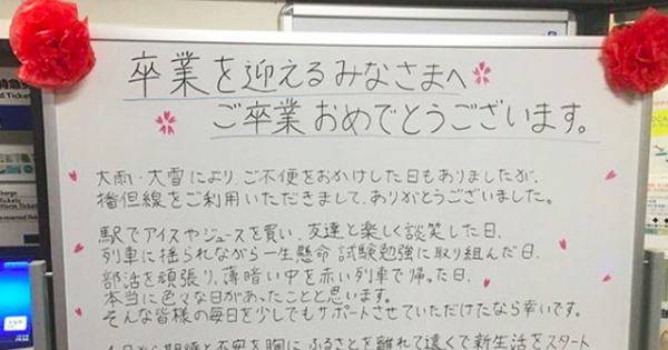 【感動….】とある駅に卒業生へのメッセージがあった…その心温まるメッセージに感動し、涙が零れ落ちる….