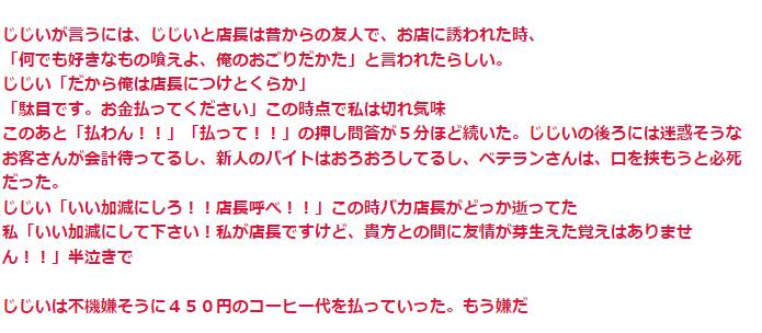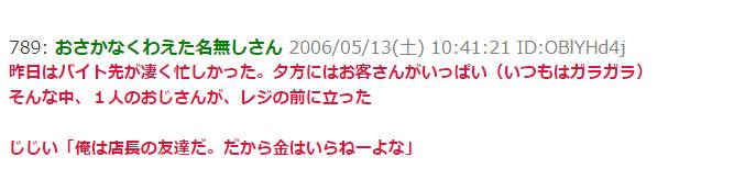 レジにて。おじさん『俺は店長の友達だ。金はいらねーよな』私「払って下さい」おじさん『払わん!』押し問答が続き…おじさん『店長を呼べ!』→