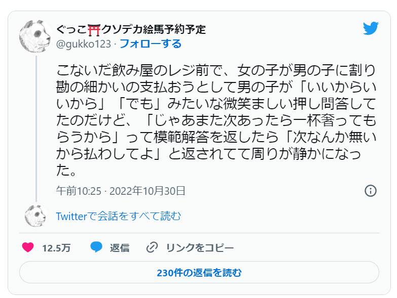 割り勘の端数まで払おうとする女性に「次一杯奢って」と断った男性。→これに対して女性が返した言葉にその場が凍りついた・・・