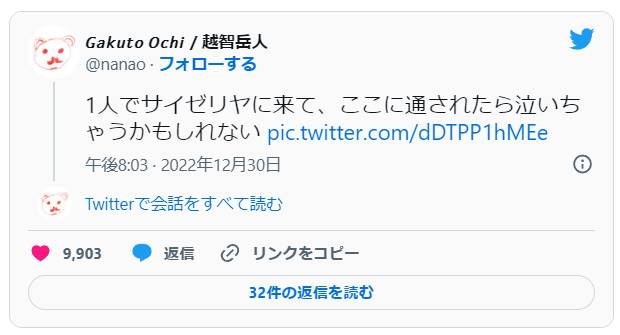 「1人でサイゼリヤに来て、ここに通されたら泣いちゃう」と投稿された一枚。