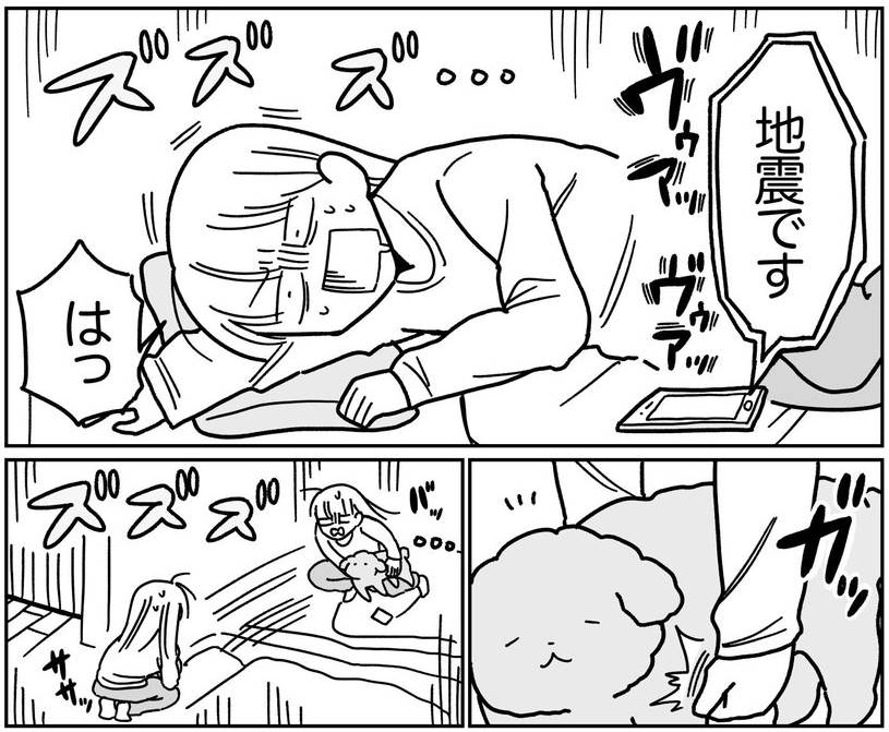 地震と私とイッヌ。彼は雷と台風にもまったく動じないです。