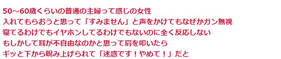 新幹線にて。私「あのー」通路側のオバサン「…。」席に座らせてくれない。私(耳が不自由?)肩トントン。オバサン「迷惑です!やめて!」→結果・・・