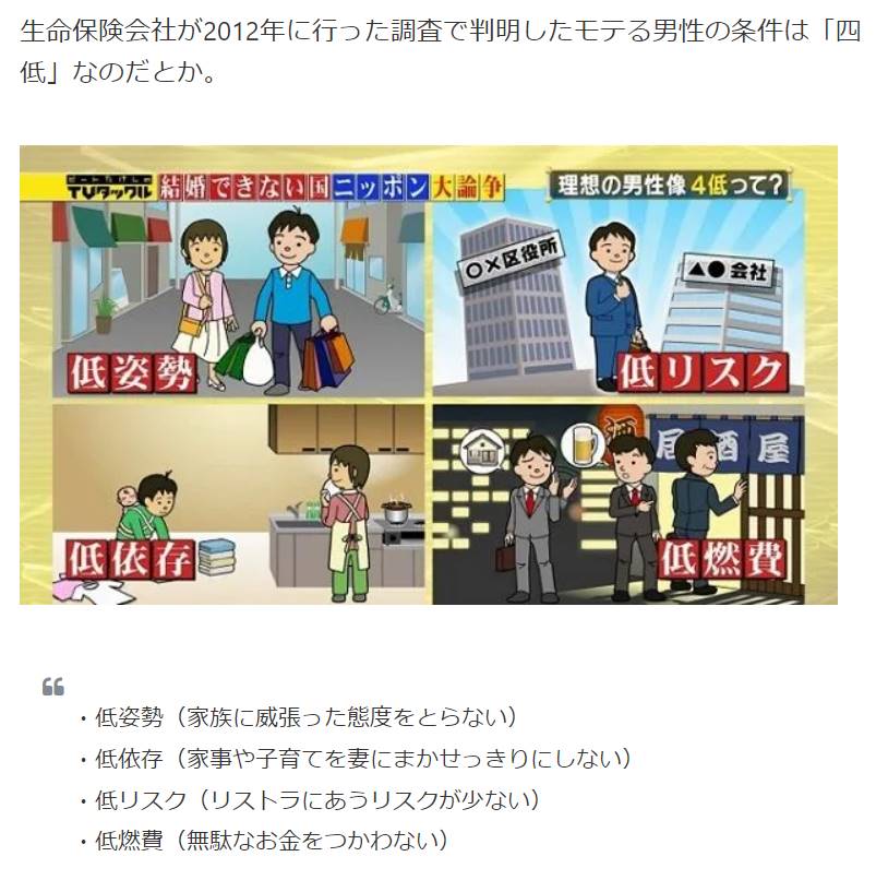 女性が結婚相手の男性に求めるのは四低と3生男子…