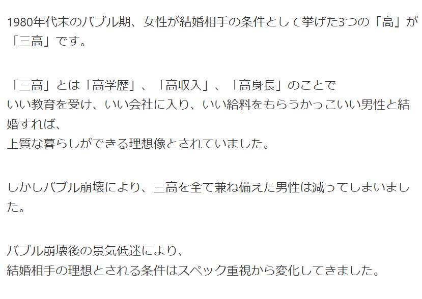 女性が結婚相手の男性に求めるのは四低と3生男子…三高なんて遥か昔の話だった…