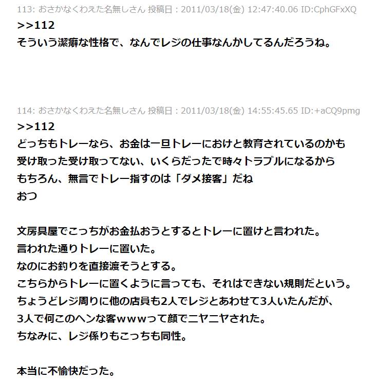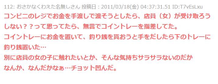 コンビニ店員(女)「○○円です」俺『はい(手渡し』店員「・・・」俺『??』→無言でコイントレーを指差している・・・