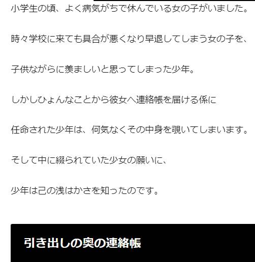 「いつかきっと、遊ぼうね。」病気で休みがちの同級生に毎日連絡帳を届けた少年。面倒とかずるいと思いコッソリ中身を覗いてみると….