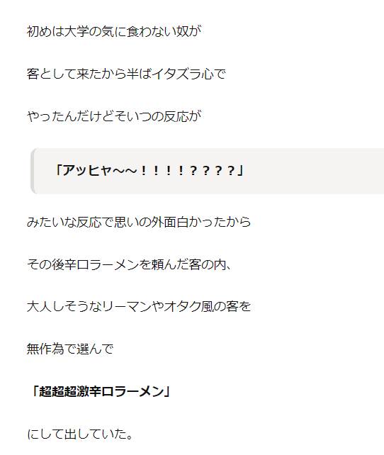 お客「辛口ラーメン下さい….」俺「は~い」俺は、遊び半分で「超超超激辛口」の味付けにして客に出していた。