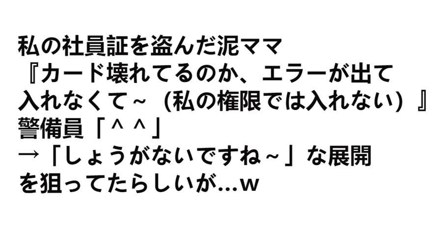 【衝撃】私の社員証を盗んだ泥ママ『カード壊れてるのか、エラーが出て入れなくて~(私の権限では入れない)』警備員「^^」→「しょうがないですね~」な展開を狙ってたらしいが…w