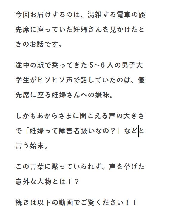 優先座席に座っていた妊婦さんに聞こえるように「妊婦って障害者扱い?」と言う数人の大学生。この言葉に黙っていられなかった意外な人物とは!?