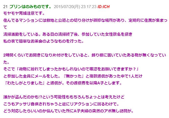 マンションの清掃活動の後、我が家でお茶会をしたら飾り棚に置いていた物が無くなっていた。参加者に「確認お願いします」とメールしたら、A子から「私がやりました」と返信が→結果